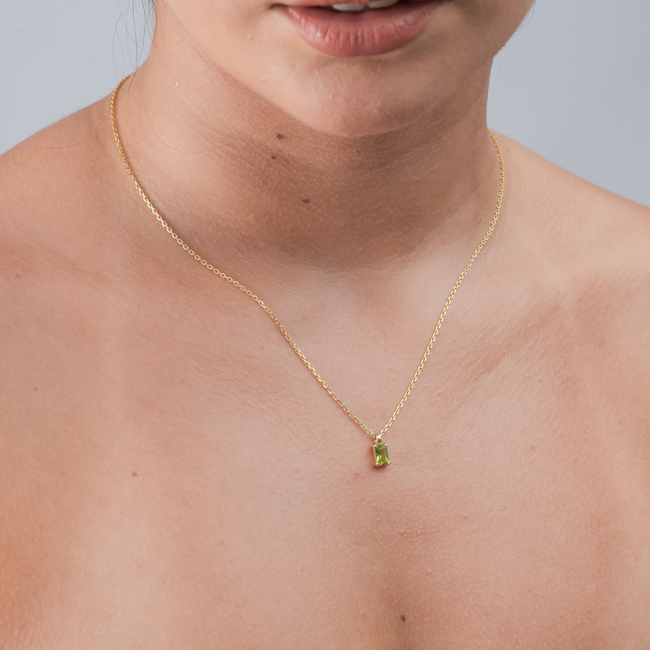 Sleek and modern, the Peridot Baguette Necklace brings a minimalist yet striking edge to your jewelry collection. The design features a 0.5-carat baguette-cut peridot gemstone, symbolizing vitality and positive energy. Expertly set in a frame of 18kt gold plating, this necklace is both durable and elegant. The 18-inch chain offers a flattering fit on the neckline, making this piece perfect for both everyday wear and special evenings. Its refined style makes it a thoughtful gift for those who appreciate understated luxury.