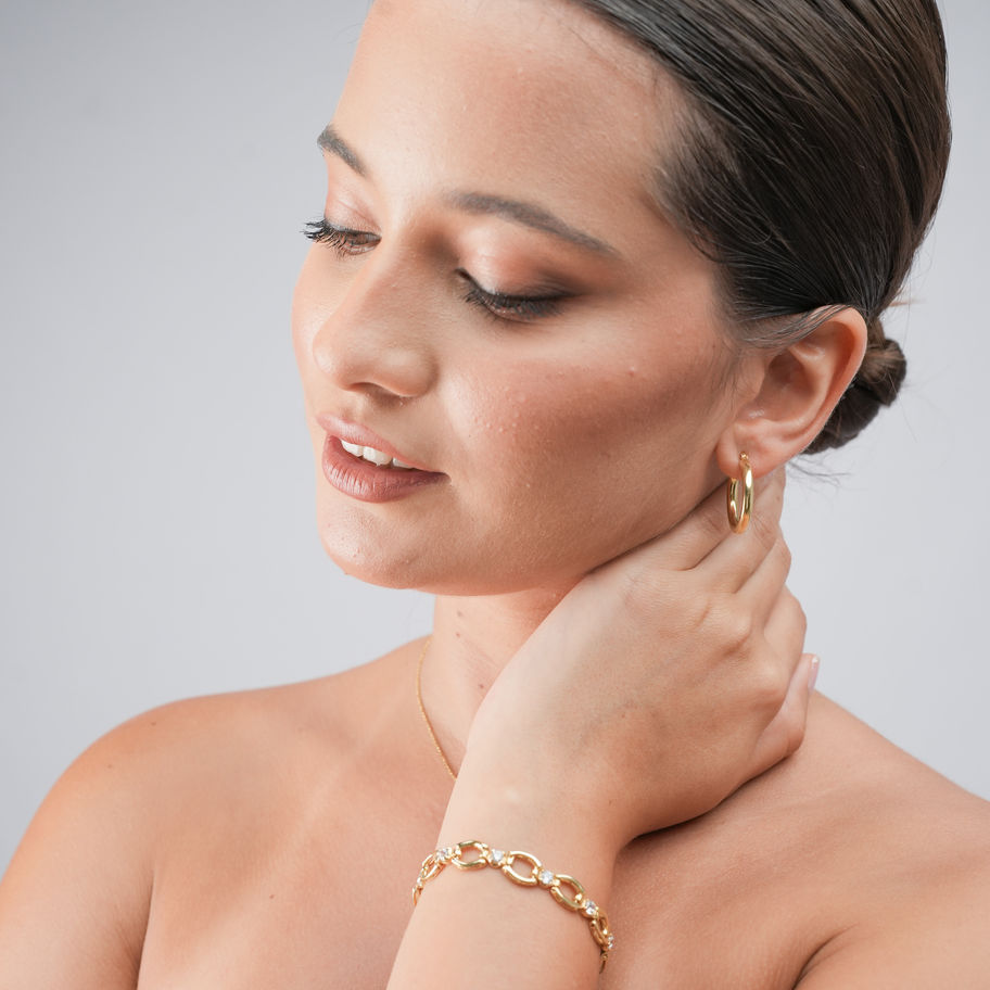 The Studded Classic Bracelet is a sparkling essential, featuring a refined row of American diamonds that catch the light beautifully with every movement. Plated in 18kt gold and designed at 15cm, this bracelet is both elegant and versatile, perfect for adding a dash of glamour to casual outfits or complementing formal wear.