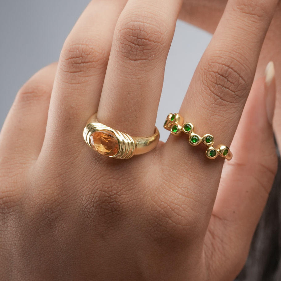 A delicate floral-inspired piece, the Gardenia Ring showcases six vivid tsavorite stones, known for their lush green hue and sparkle. Set in 18kt gold plating with a 19mm band, this ring captures the elegance of nature and makes for a beautiful, eye-catching accessory.